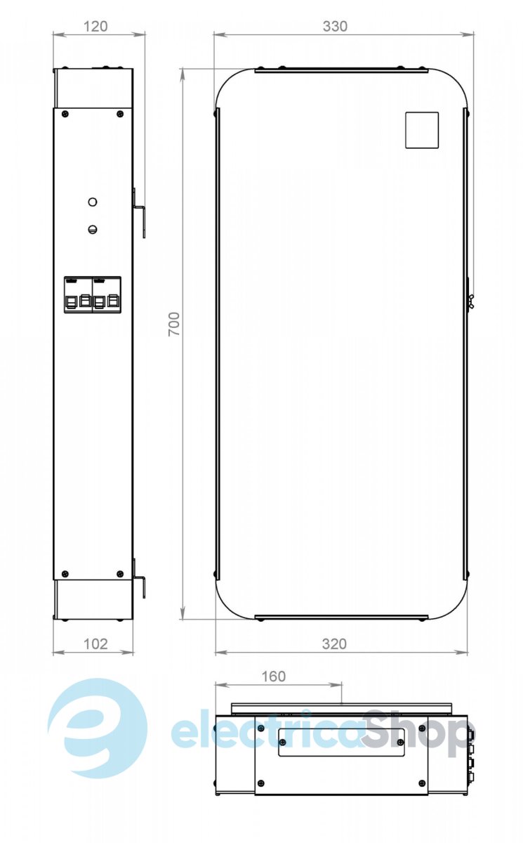 - Габарити: 700 х 320 х 120 мм (висота x ширина x глибина)
