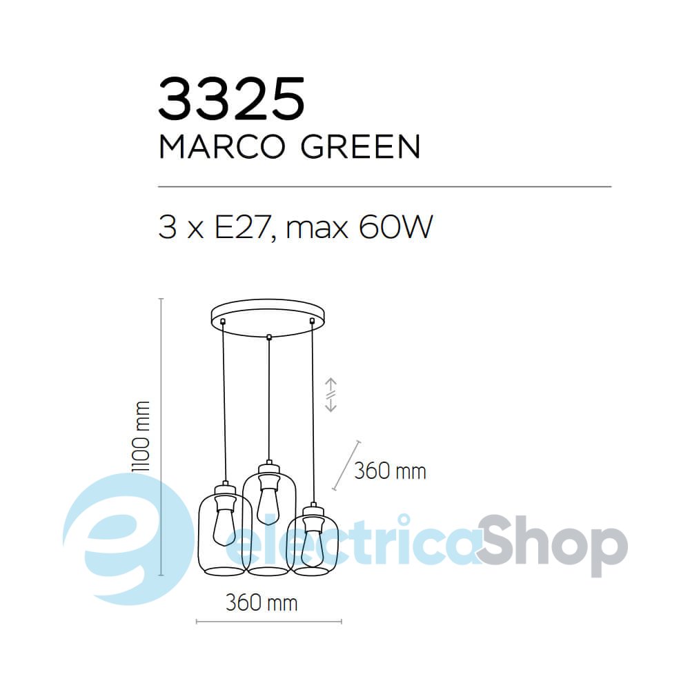 Підвісний світильник TK-Lighting MARCO GREEN 3325 матиме гарний вигляд у сучасних інтер'єрах, підійде для стилістики модерн та лофт. Арматура виготовлена з металу, плафон скляний. Добре поєднується з декоративними лампами Едісона.