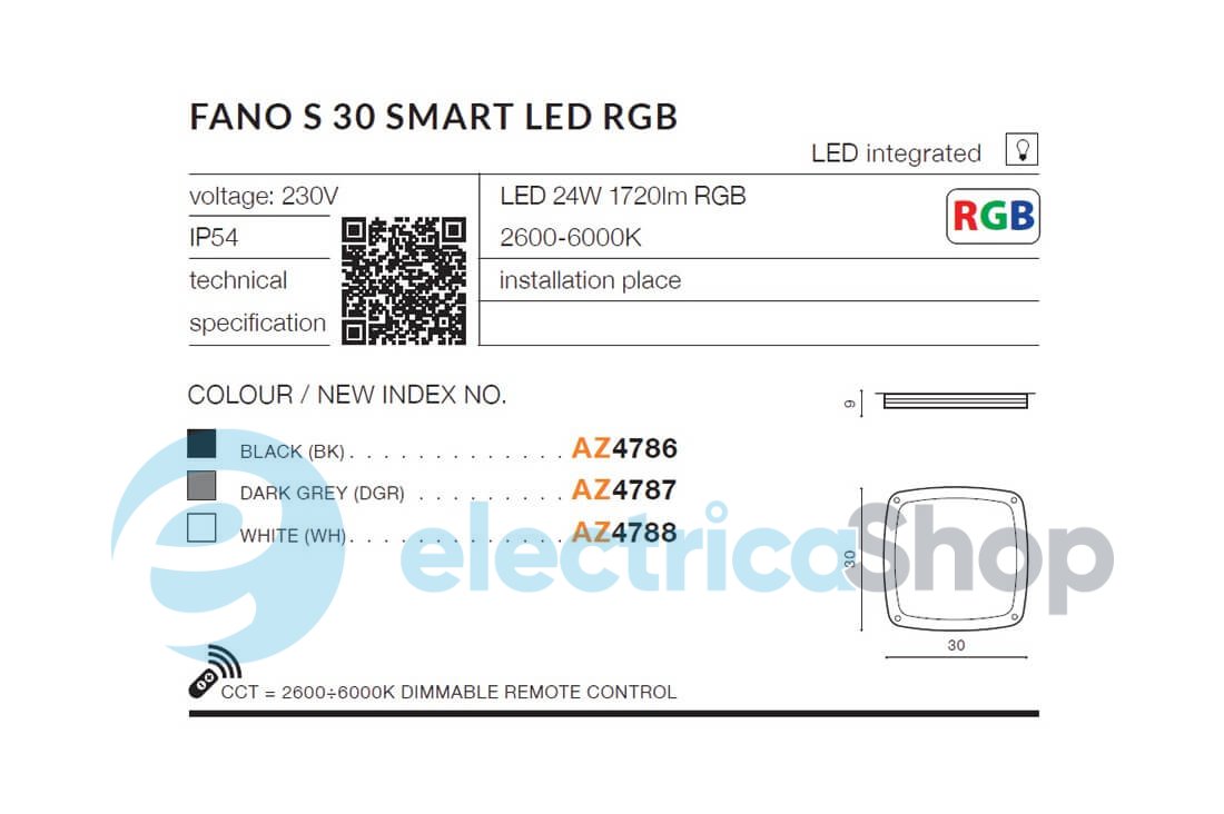 Вуличний світильник Azzardo FANO S30 SMART RGB IP54 AZ4788 підходить для сучасних дизайнів та екстер'єру. Світильник створений у мінімалістичному стилі, завдяки акуратним формам та лаконічному виконанню стане гарним доповненням для житлових, комерційних приміщень. Має високий рівень пиловологозахисту. Є вбудований led-модуль та функція RGB, регулювання яскравості та температури світла за допомогою пульта ДК.