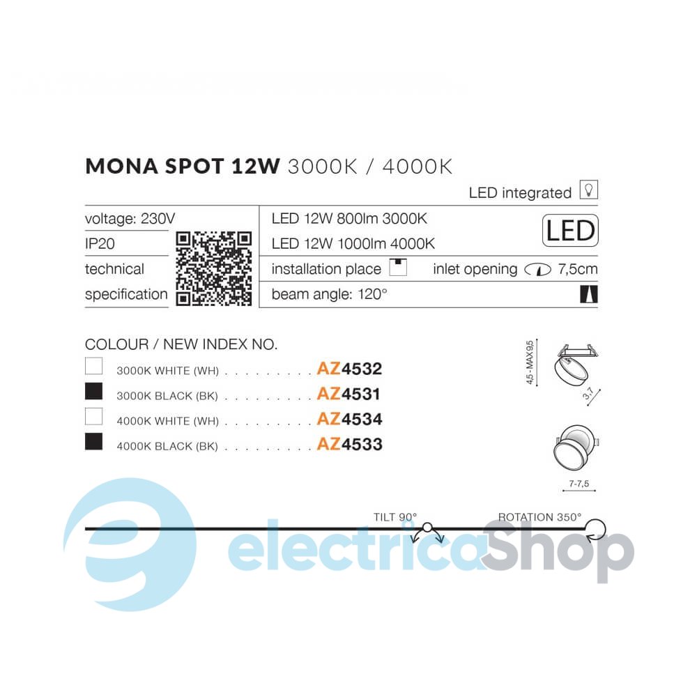 Точковий світильник Azzardo MONA SPOT 12W AZ4531 3000K матиме гарний вигляд у сучасних інтер'єрах, допоможе створити світлові акценти. Виготовлений з металу та акрилу. Кут розсіювання світла – 120°.