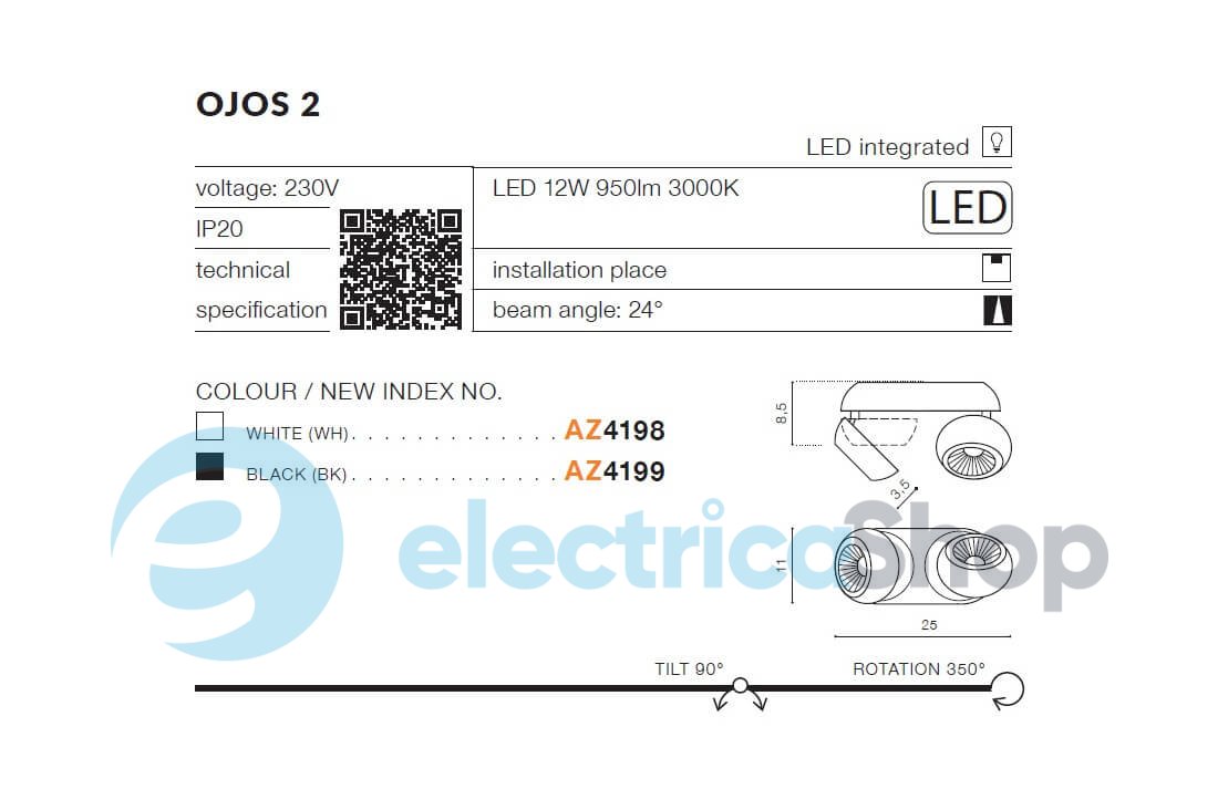 Накладний точковий світильник AZzardo OJOS 2 AZ4199 матиме гарний вигляд у сучасних інтер'єрах. Корпус світильника виготовлений з металу. Плафон поворотний, кут розсіювання світла – 24°.
