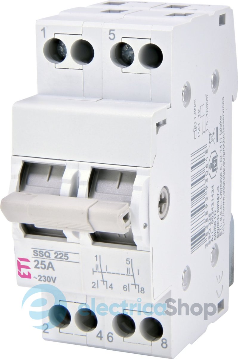 Перемикач SSQ 2421424 (це двополюсний перекидний рубильник) призначений для прямої комутації навантажень невеликої потужності (25А) або комутації за допомогою додаткових контакторів або силових реле.