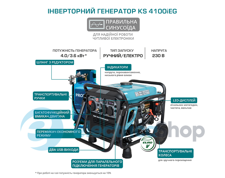 - Спеціальні функції: Газ/бензин, Паралельне підключення, Чиста синусоїда