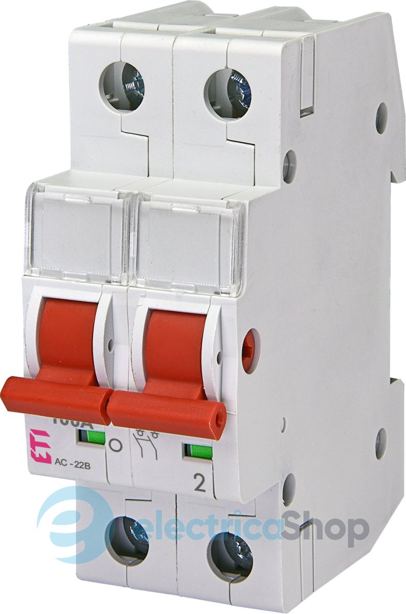 Двополюсний вимикач вимикач навантаження ETI SV2100 застосовується для встановлення в розподільчих щитах як головний вимикач, а також комутації окремих ланцюгів.