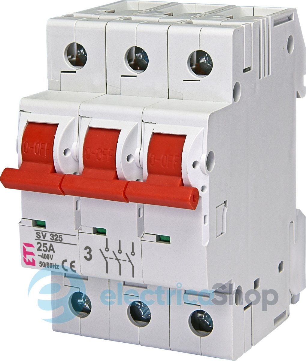 Триполюсний вимикач навантаження ETI SV325 застосовується для встановлення в розподільних щитах як головний вимикач, а також комутації окремих ланцюгів.