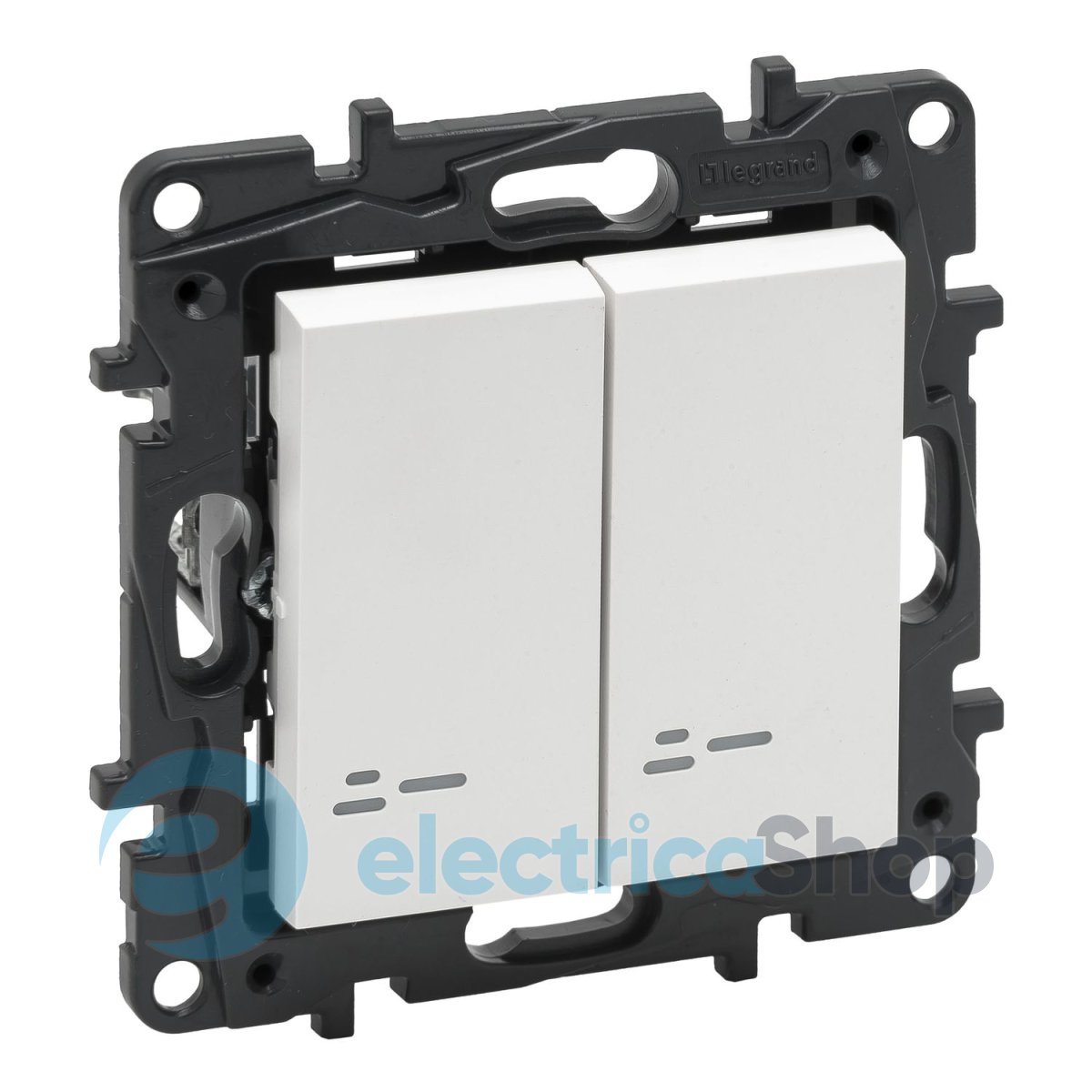 Вимикач 2-клавішний для увімкнення/вимкнення двох груп освітлення з одного місця. Вимикач має світлодіодне підсвічування, яке підсвічує клавіші у вимкненому стані.