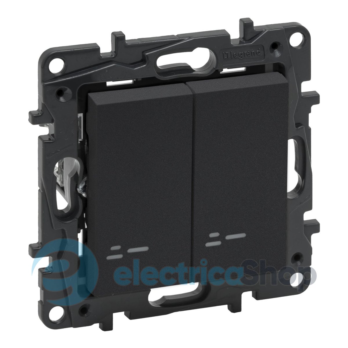 Вимикач 2-клавішний для увімкнення/вимкнення двох груп освітлення з одного місця. Вимикач має світлодіодне підсвічування, яке підсвічує клавіші у вимкненому стані.