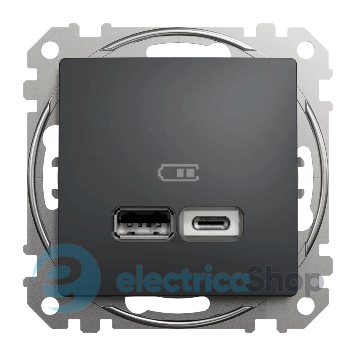 Подвійна USB-розетка з роз'ємами типу А+С є аксесуаром серії Sedna Design & Elements від Schneider Electric. USB-роз’єм для зарядки має глянцеву поверхню чорного кольору та має такі розміри: