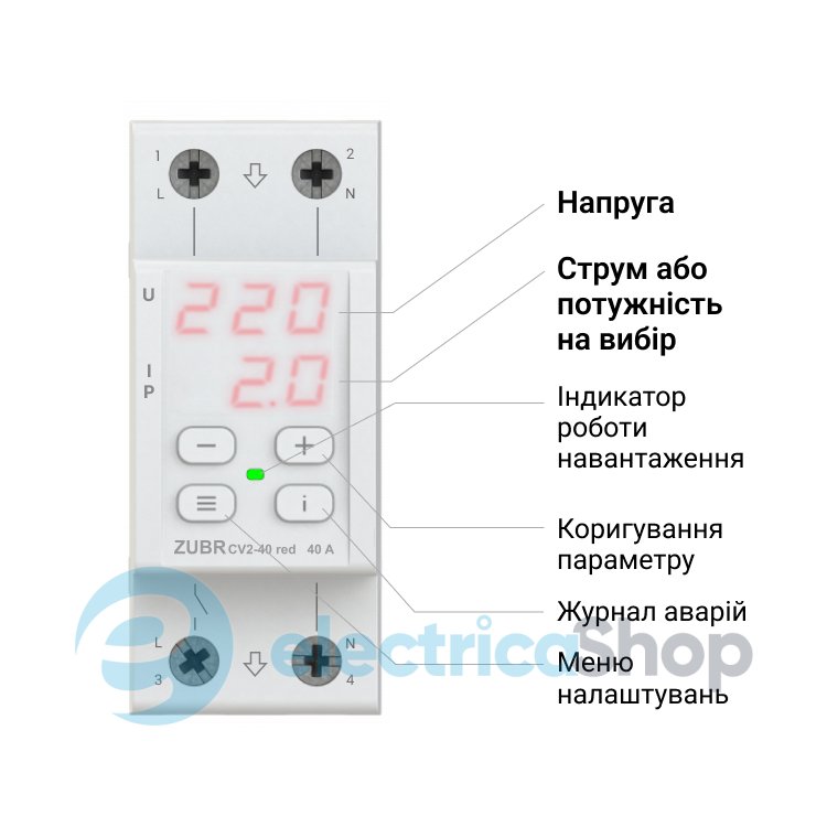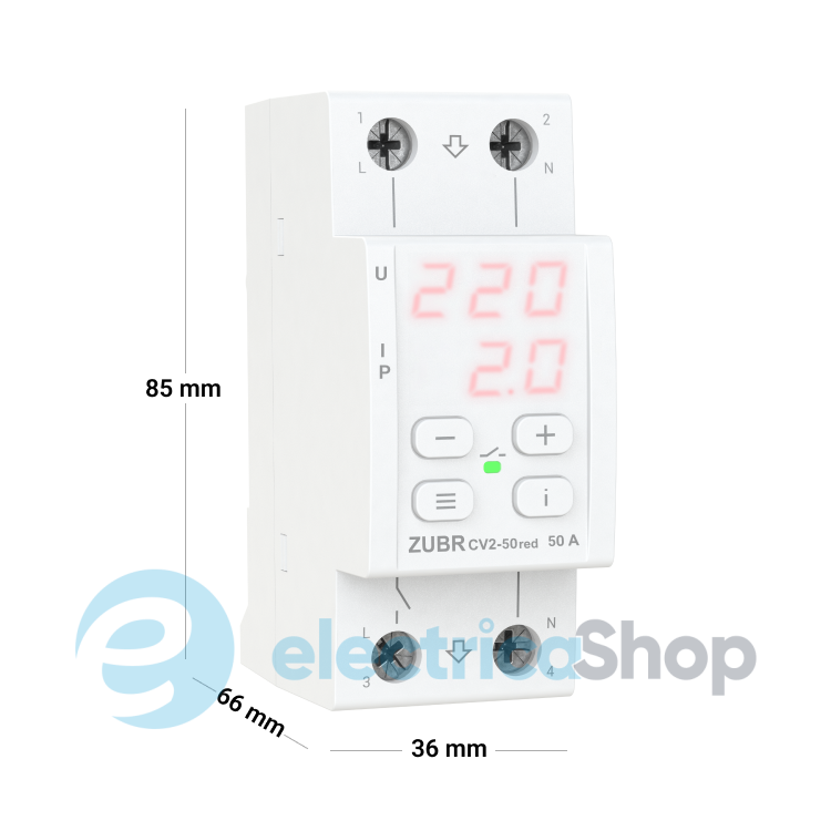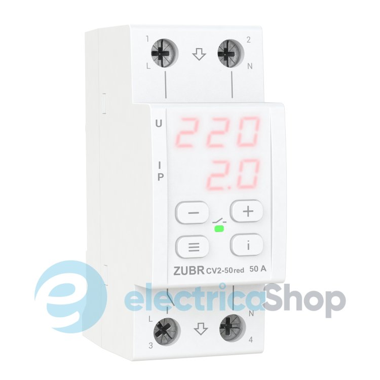 ZUBR CV2 red (50А) захищає обладнання від високої та низької напруги, обриву нуля, а також обмежує споживання струму чи потужності.