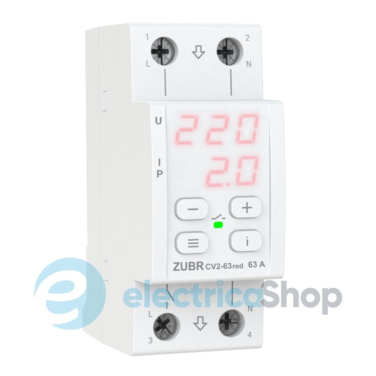 ZUBR CV2 red (63А) захищає обладнання від високої та низької напруги, обриву нуля, а також обмежує споживання струму чи потужності.
