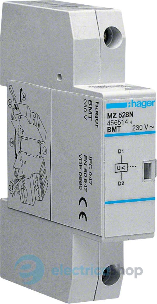 Розчіплювач мінімальної напруги MZ528N використовується для автоматичного вимикача захисту двигуна Hager з 1 та 2 типорозміром.