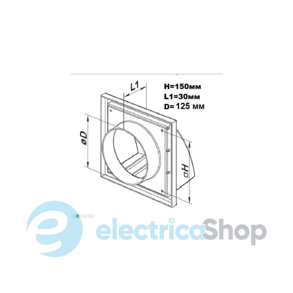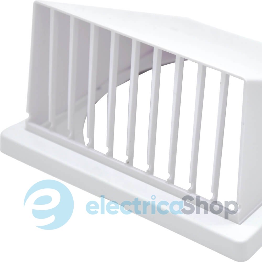 Решітка вентиляції AirRoxy виготовлена з пластику, габарит: 150х30х125 мм. Встановлюється на вихід із вентиляційної системи. Завдяки формі вода ззовні не потрапляє у вентиляцію. Доповнена сіткою.