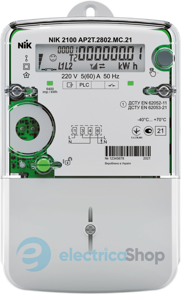 - Код постачальника: NIK 2100 AP6T.2202.MC.11 11 220В 5(80)А М2, 4 тарифи, РКІ, реле управління навантаженням та відключення споживача, індикація впливу магнітного та радіо поля