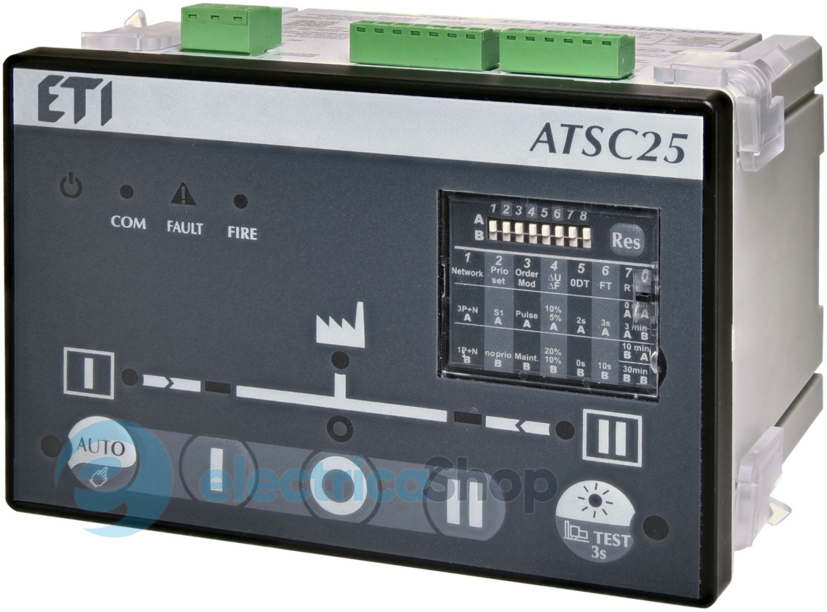 Контролер ATSC25 вимірює напругу та частоту по трьом фазам, самостійно обираючи мережу живлення, а також має релейний вихід для запуску генератора.