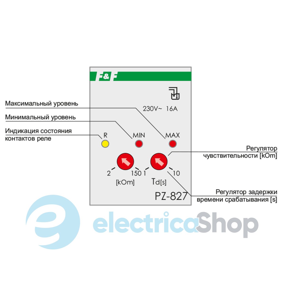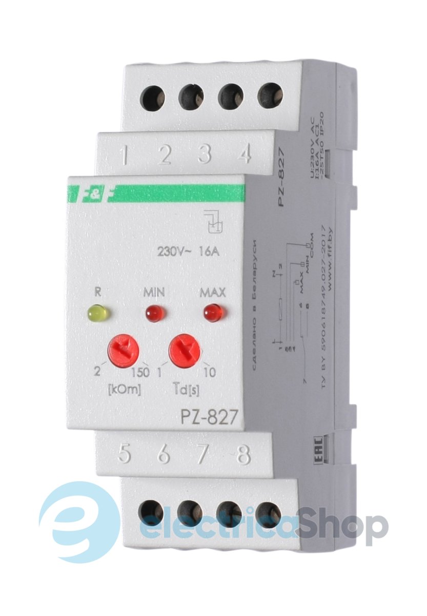 Реле контролю рівня PZ-827 призначене для контролю та підтримки заданого рівня струмопровідних рідин у резервуарах, басейнах, водонапірних вежах тощо. та керування електродвигунами насосного обладнання. Для контролю рівня реле використовує кондуктометричний спосіб. Для вимірювання рівня неелектропровідних рідин та сипких матеріалів застосовуються поплавкові або інші датчики, призначені для цих цілей.