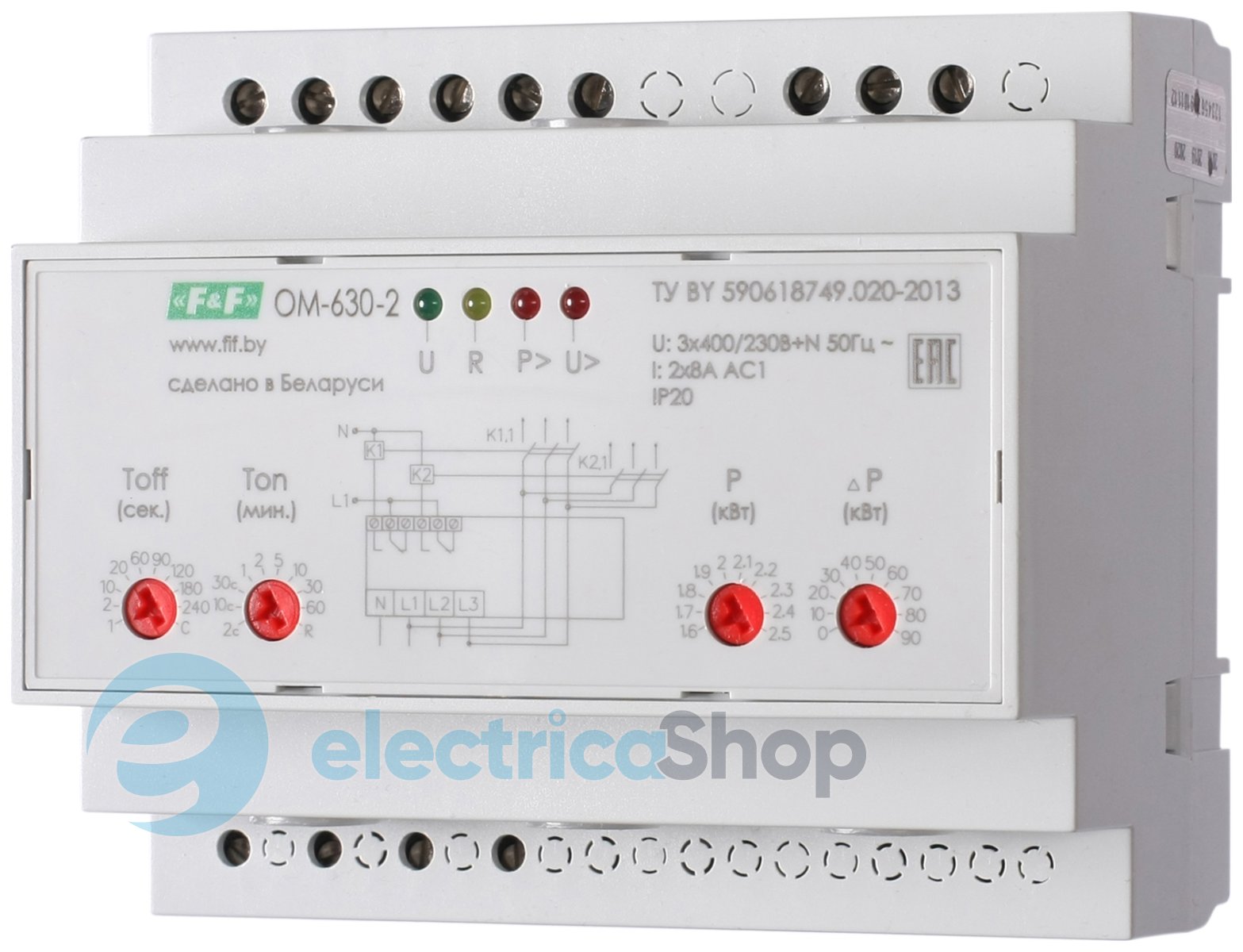 Обмежувач потужності OM-630-2 трифазний, багатофункційний, для роботи з трансформаторами струму з навантаженням більше ніж 50 кВт, призначений для безперервного контролю споживаної від мережі живлення потужності і відключення навантаження при перевищенні її понад встановленого значення та захисту електричних кіл живлення від короткого замикання. Обмежувач захищає так само споживачів електроенергії (навантаження) від перепадів напруги, що виникають в 3-х фазних мережах при обриві нульового проводу.