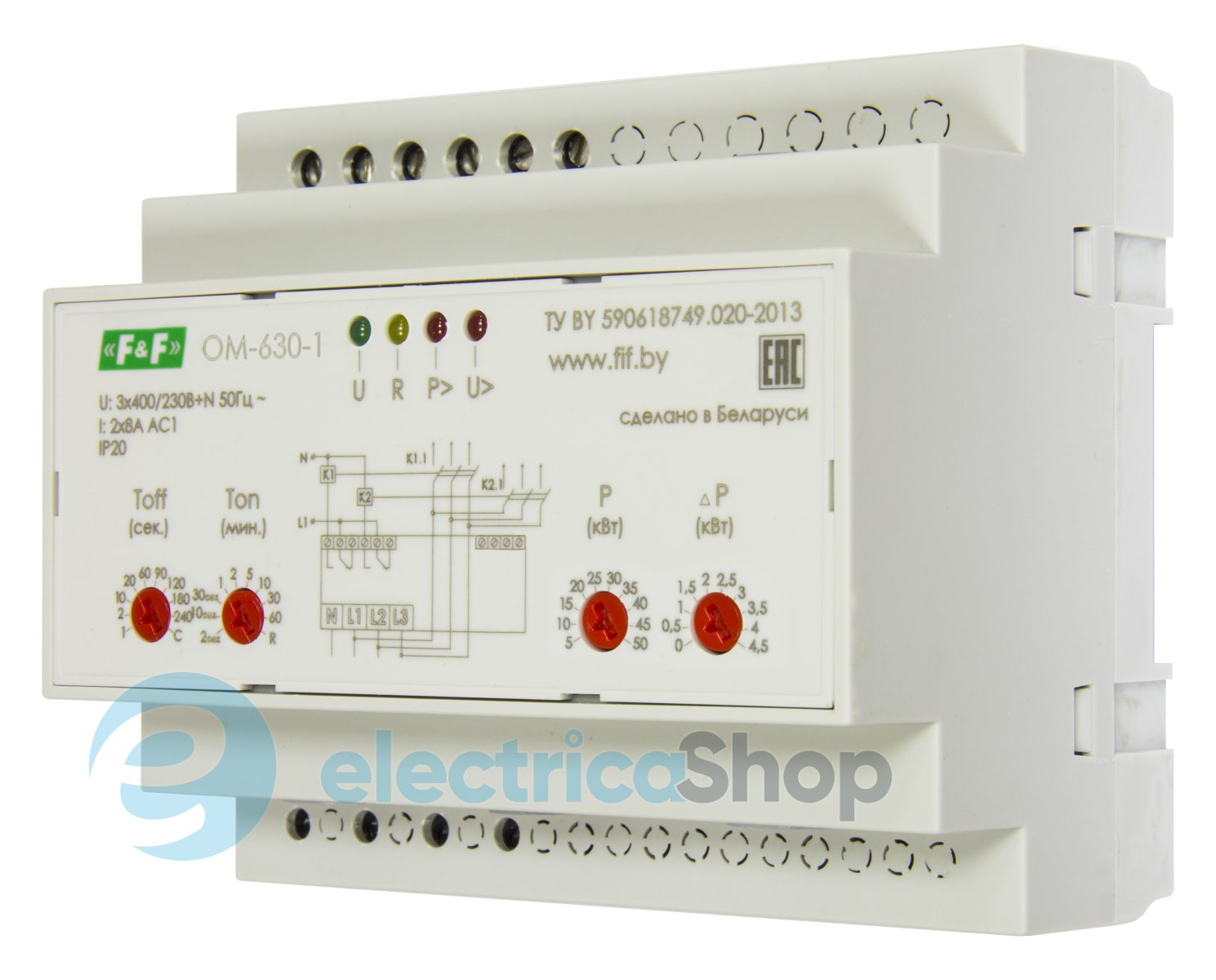 Призначення Обмежувач потужності OM-630-1 трифазний, багатофункційний, 5-50 кВт, обмеження потужності від 1,5 кВт, USB порт для налаштування параметрів - призначений для безперервного контролю потужності споживаної від мережі живлення і відключення навантаження при перевищенні її понад встановленого значення та захисту кіл живлення від короткого замикання. Обмежувач також захищає споживачів електроенергії (навантаження) від перепадів напруги, що виникають в 3-х фазних мережах при обриві нульового проводу.