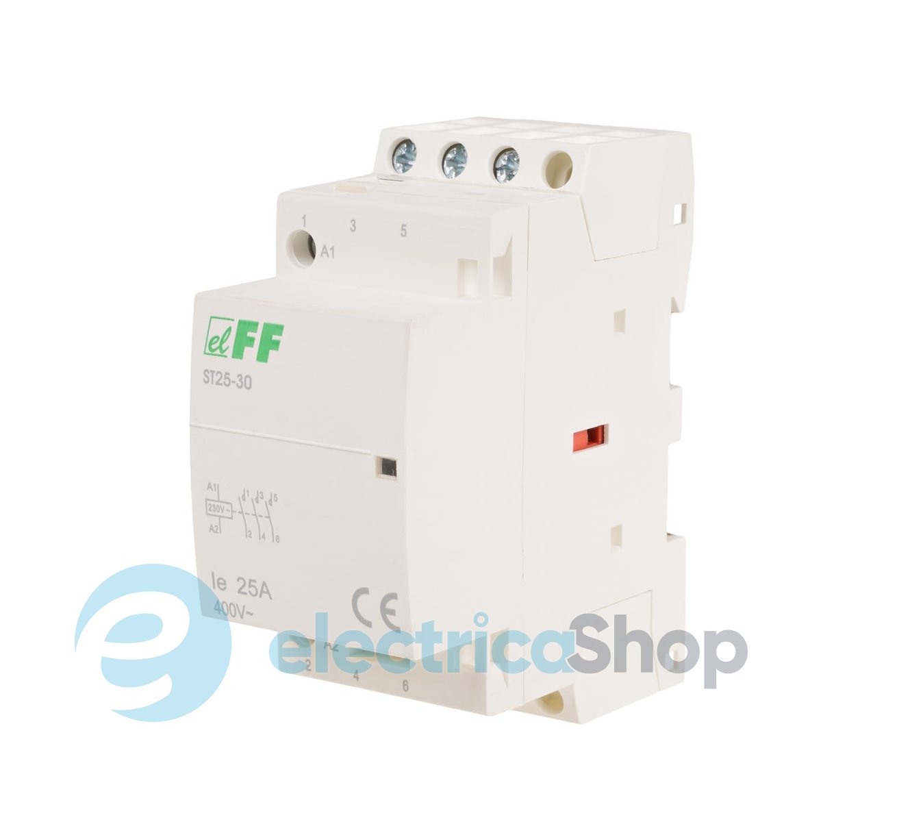 потужн мод. вага підкл. ST25-20 2NO 25A 230В AC 2,2Вт 1 106г 4мм² ST25-20/24 2NO 25A 24В AC 2,2Вт 1 106г 4мм² ST25-11 1NO+1NC 25A 230В AC 2,2Вт 1 106г 4мм² ST25-30 3NO 25A 230В AC 4,0Вт 2 168г 4мм² ST25-31 3NO+1NC 25A 230В AC 4,0Вт 2 168г 4мм² ST25-31/24 3NO+1NC 25A 24В AC 4,0Вт 2 168г 4мм² ST25-40 4NO 25A 230В AC 4,0Вт 2 168г 4мм² ST25-40/24 4NO 25A 24В AC 4,0Вт 2 168г 4мм² ST25-04 4NC 25A 230В AC 4,0Вт 2 168г 4мм² ST25-22 2NO+2NC 25A 230В AC 4,0Вт 2 168г 4мм² ST40-40 4NO 40A 230В AC 6,4Вт 3 241г 10мм² ST40-40/24 4NO 40A 24В AC 6,4Вт 3 241г 10мм² ST40-31 3NO+1NC 40A 230В AC 6,4Вт 3 241г 10мм² ST63-40 4NO 63A 230В AC 6,4Вт 3 241г 10мм² ST63-40/24 4NO 63A 24В AC 6,4Вт 3 241г 10мм² ST63-31 3NO+1NC 63A 230В AC 6,4Вт 3 241г 10мм² - Напруга живлення: 230 В AC