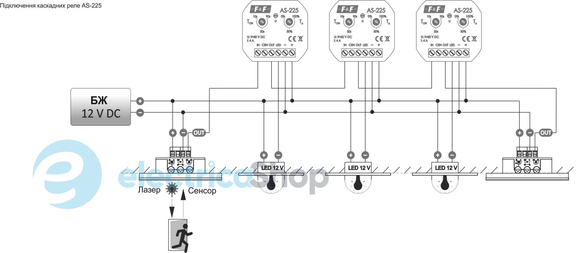 Реле каскадне AS-225D F&F 12канал., DIN 9-30V DC/4А 3÷30сек. з функцією послідовного вкл.