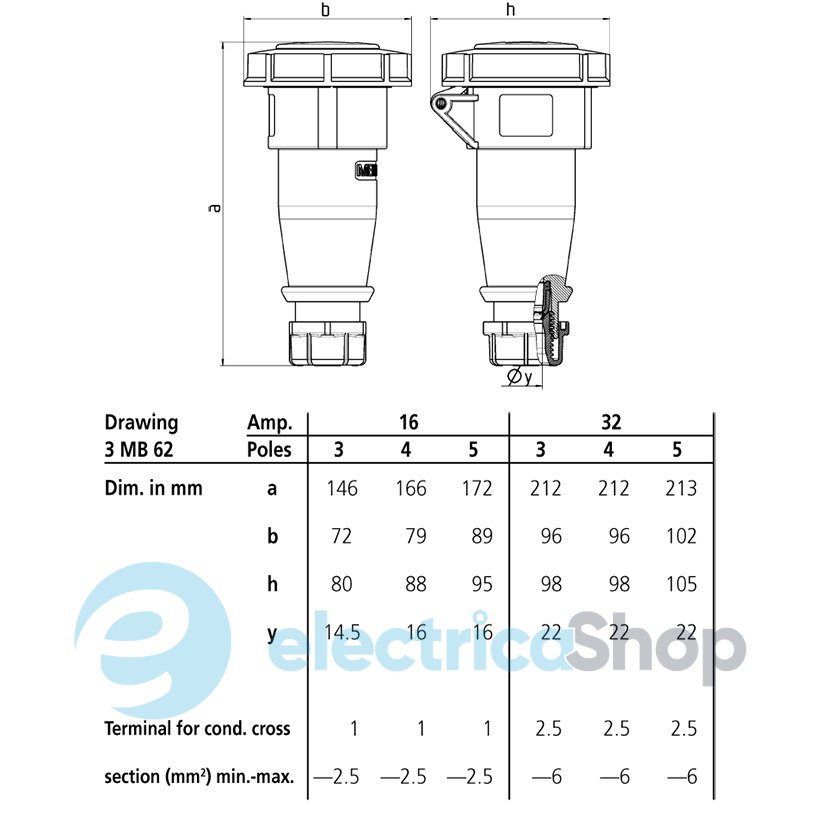Кабельна розетка CEE-типу MENNEKES серії AM-TOP 16А 5п 400В зі ступенем захисту IP67. Розетка AM-TOP завдяки цільному відлитому корпусу та кришці з байонетним кільцем з гумовим ущільнювачем має клас захисту IP67. Ця розетка має 5 контактів (3 фази + нуль + земля). Положення контакту заземлення – на 6 годин. Контакти стандартні, з латуні. Підключення кабелю – через гвинтові клеми. Кабельний ввід з гумовим ущільненням забезпечує розвантаження натягу та захист від перегинання кабелю. Країна виробництва – Німеччина.