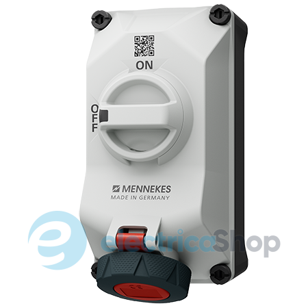 Розетка настінна CEE-типу з механічним відключенням типу DUO від MENNEKES 16А 4п 400В зі ступенем захисту IP67. Ця розетка має 4 гнізда (3 фази + земля). Підключення кабелю - гвинтові клеми. Механічне DUO-блокування. Конструкція ручки вимикача дає можливість вішати навісний замок у положенні "Вимк.", щоб запобігти несанкціонованій подачі напруги на розетку. Країна виробництва - Німеччина.
