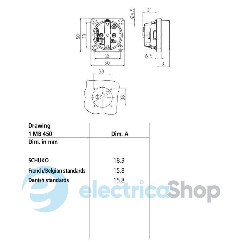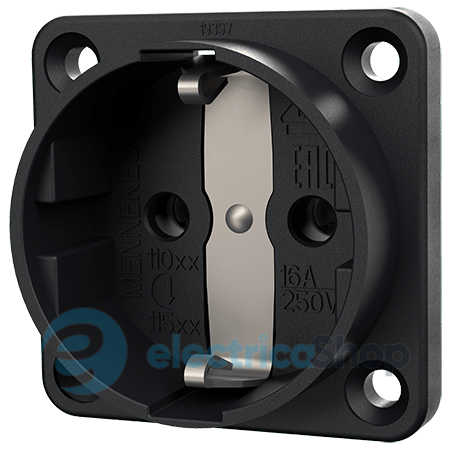 Розетка панельна типу Schuko 16А 2п+З 230В від MENNEKES чорного кольору без захисної кришки. Ударостійка. Без шторок захисту від дітей. Гвинтові клеми для жил перетином 1,5 - 2,5 мм². Без кришки. Квадратний фланець 50х50 мм, з чотирма отворами для кріплення 38х38 мм. Підходить для монтажу в коробку артикул 10716. Країна виробництва – Німеччина.