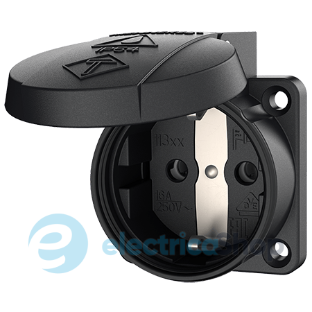 Розетка панельна типу Schuko 16А 2п+З 230В від MENNEKES чорного кольору зі ступенем захисту IP54. Ударостійка. Без шторок захисту від дітей. Три пружинних клеми (клеми push-in) для жил перетином 1,5 - 2,5 мм². Кришка на пружині, для забезпечення степеня захисту IP54 навіть у непідключеному стані. Квадратний фланець 50х50 мм, з чотирма отворами для кріплення 38х38 мм. Країна виробництва – Німеччина.