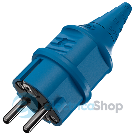 Штекер кабельний типу Schuko 16А 2п+З 230В від MENNEKES синього кольору зі ступенем захисту IP44. Має комбінований PE провідник відповідно до німецького та французсько-бельгійського стандарту. Гвинтові клеми. Підходить для підключення кабелів з кількістю жил та перетином до 3 x 2.5 мм², наприклад типу H07RN-F. Кабельний ввід виконаний у вигляді гумового конуса що має східчасту структуру, яка підрізається відповідно до діаметра кабелю, що підключається.