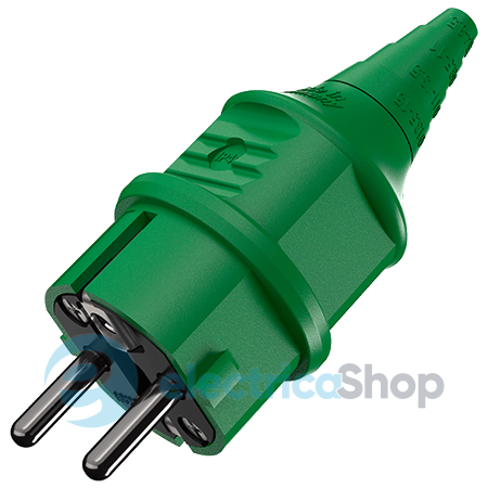 Штекер кабельний типу Schuko 16А 2п+З 230В від MENNEKES зеленого кольору зі ступенем захисту IP44. Має комбінований PE провідник відповідно до німецького та французсько-бельгійського стандарту. Гвинтові клеми. Підходить для підключення кабелів з кількістю жил та перетином до 3 x 2.5 мм², наприклад типу H07RN-F. Кабельний ввід виконаний у вигляді гумового конуса що має східчасту структуру, яка підрізається відповідно до діаметра кабелю, що підключається.