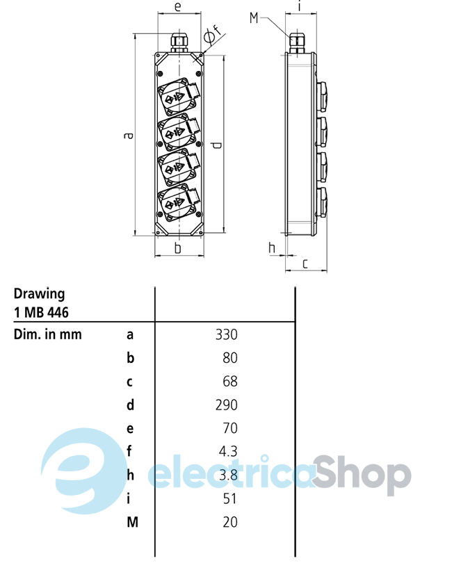 Колодка з 4 розетками типу Schuko, ступінь захисту IP44. З підготовленою внутрішньою проводкою. Корпус сірого кольору RAL 7035 (світло-сірий) виконаний з матеріалу AMAPLAST. Металевий підвіс входить до комплектації.