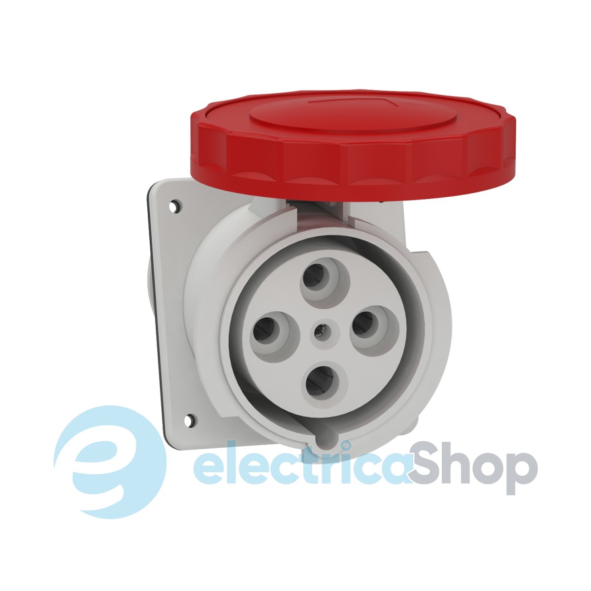 Промислова розетка панельная кутова Kaedra Box з гвинтами, що не випадають. Конфігурація полюсів: 3P+N, номінальний струм 125А, робоча напруга 415V змінного струму. Ступінь захисту : IP67. Частота 50Гц чи 60Гц. Положення контактів за годинниковою стрілкою - 6 год.