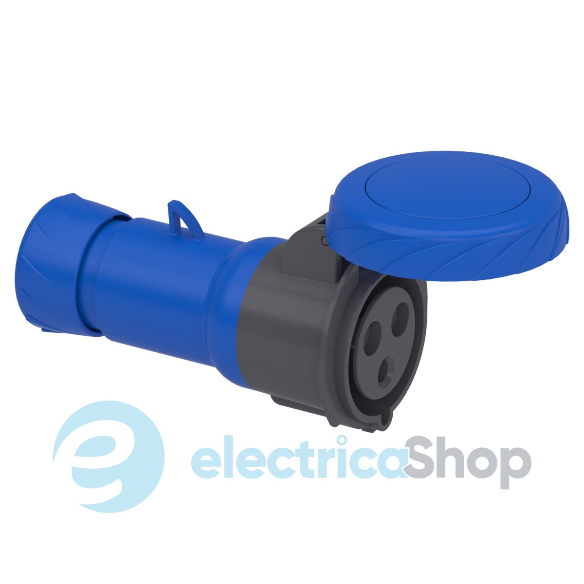 Промислова кабельна розетка PratiKa з гвинтами, що не випадають. Конфігурація полюсів 2P+E, номінальний струм становить 32 А, а робоча напруга становить 200-250 В змінного струму. Розміри пластини для кріплення (Ш) 99 мм x (В) 99 мм. Ступінь захисту IP67 і IK08. Вогнестійкість 850°C. Кабельні вводи призначені для гнучких або жорстких кабелів. Поперечний переріз кабелів 32A становить 11,5 мм до 21 мм для кабелів від 2,5 мм² до 10 мм². Колір розетки світло-сірий (RAL 7035) з синім для легкої ідентифікації робочої напруги. Частота 50 Гц або 60 Гц. Положення контактів за годинниковою стрілкою - 6 год.