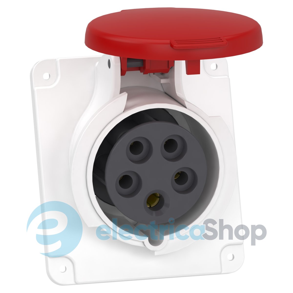 Промислова розетка панельна кутова Kaedra Box з гвинтами, що не випадають. Конфігурація полюсів: 3P+N+E, номінальний струм 16А, робоча напруга 380V змінного струму. Ступінь захисту : IP44. Частота 50Гц чи 60Гц. Положення контактів за годинниковою стрілкою - 6 год.