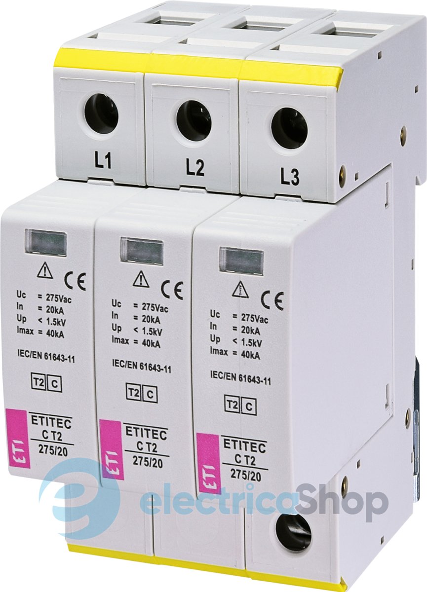 Обмежувач перенапруги ETITEC C T2 275/20 (3+0) 3p призначен для захисту електричного обладнання від перенапруги, джерелом якої є комутаційні процеси в електричній мережі, а також віддалені чи близькі, але вже ослаблені, атмосферні розряди. Встановлюються у поверхових розподільних пристроях як другий ступінь захисту. У випадку виходу із ладу обмежувача перенапруги спрацьовує тепловий захист, який сигналізує про необхідність заміни пристрою.