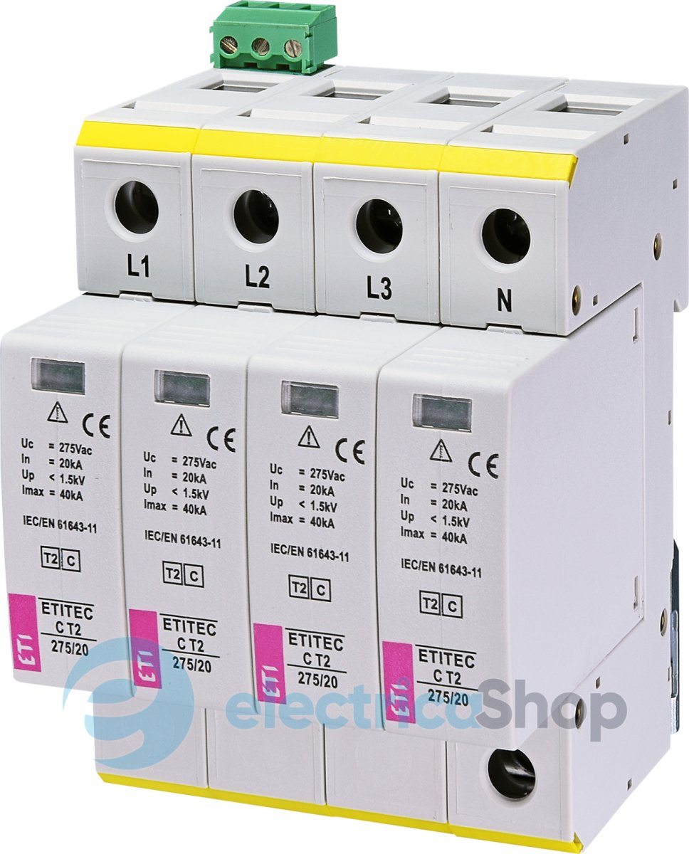 Обмежувач перенапруги ETITEC C T2 275/20 (4+0) 4p, RC призначен для захисту електричного обладнання від перенапруги, джерелом якої є комутаційні процеси в електричній мережі, а також віддалені чи близькі, але вже ослаблені, атмосферні розряди. Встановлюються у поверхових розподільних пристроях як другий ступінь захисту. У випадку виходу із ладу обмежувача перенапруги спрацьовує тепловий захист, який сигналізує про необхідність заміни пристрою.