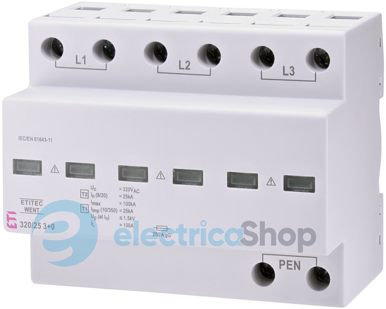 Обмежувач перенапруги (ПЗІП) ETITEC T WENT 320/25 (3+0, 6p, TNC) (2440368) – призначені для встановлення всередині об’єктів (будівель) для захисту електричних мереж та устаткування.
