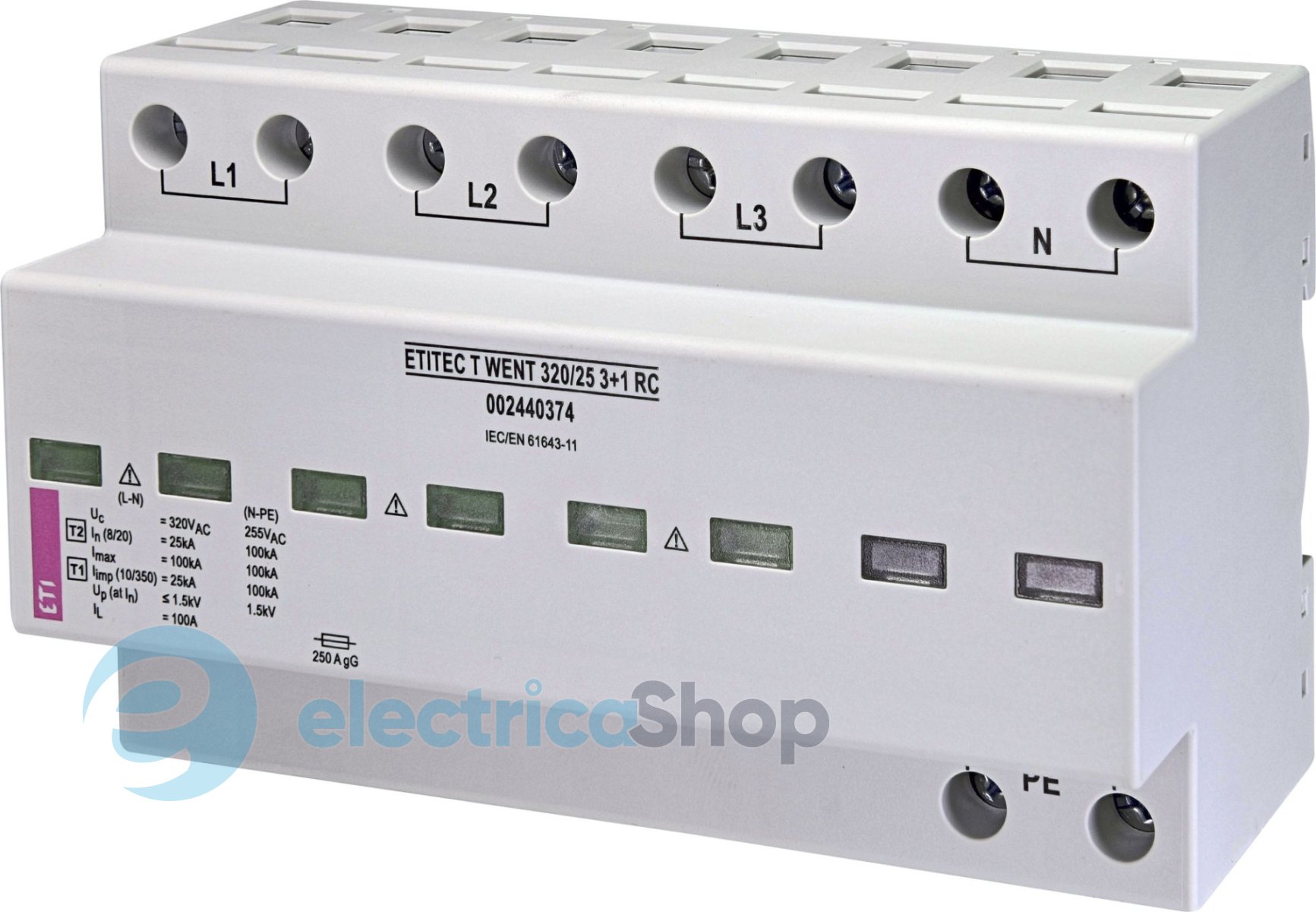 Обмежувач перенапруги (ПЗІП) ETITEC T WENT 320/25 (3+1, 8p, TT) (2440369) – призначені для встановлення всередині об’єктів (будівель) для захисту електричних мереж та устаткування.