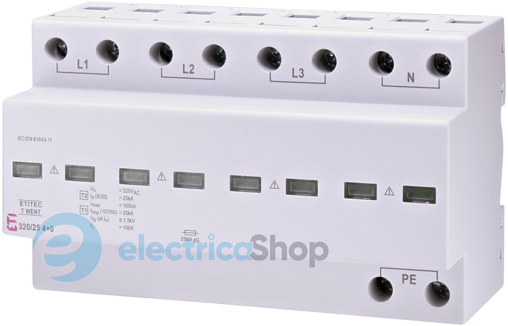 Обмежувач перенапруги (ПЗІП) ETITEC T WENT 320/25 (4+0, 8p, TNC-S) (2440370) – призначені для встановлення всередині об’єктів (будівель) для захисту електричних мереж та устаткування.