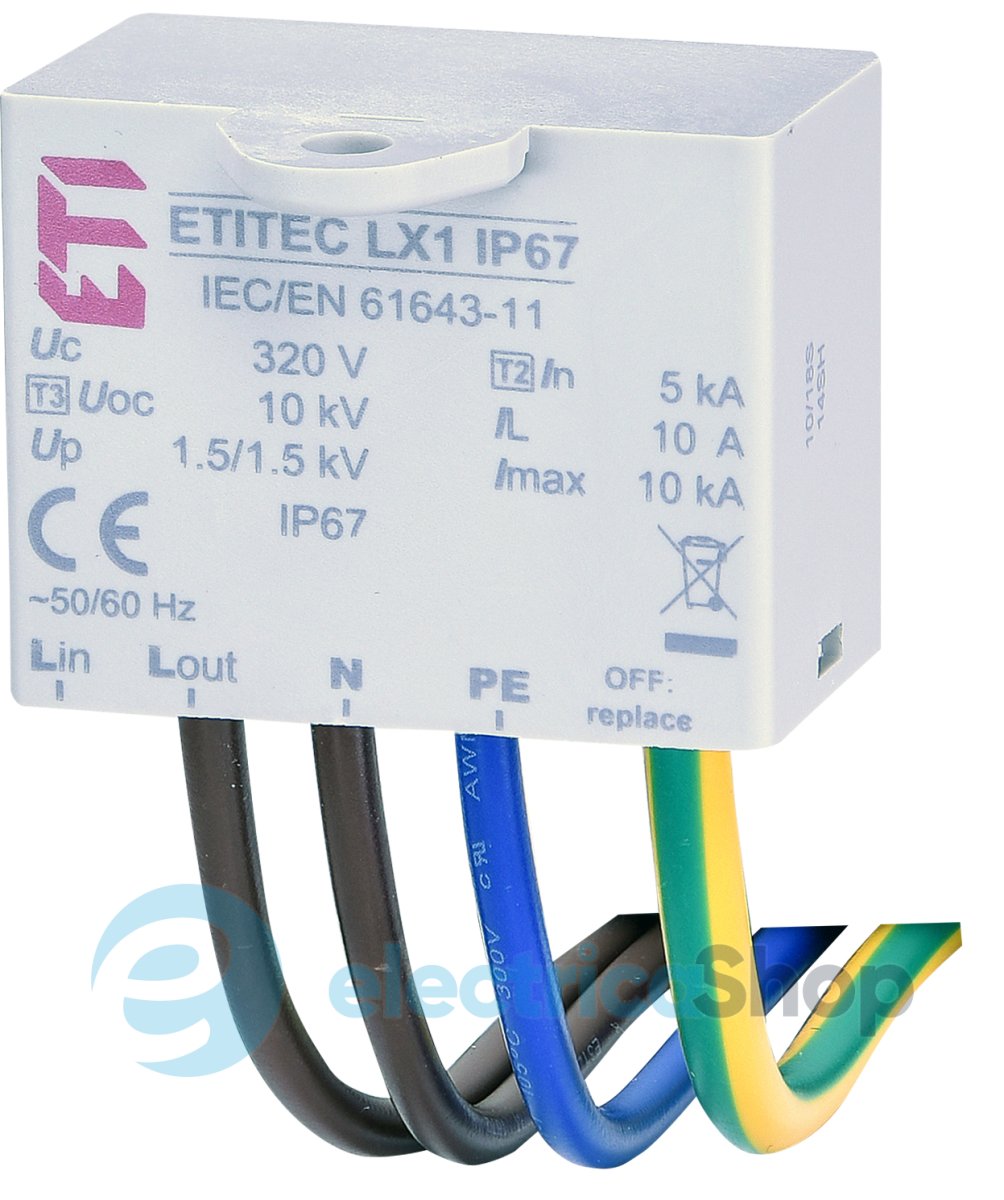 Розрядник ETITEC LX1 IP67 – має ультракомпактні габаритні розміри, установка на монтажну панель / монтажну коробку/ кабельні розподільні канали, індикація виходу із ладу, клас ізоляції І або ІІ, захист відповідно до класу ІІ+ІІІ/Т2+Т3/С+D, ступінь захисту ІР67.