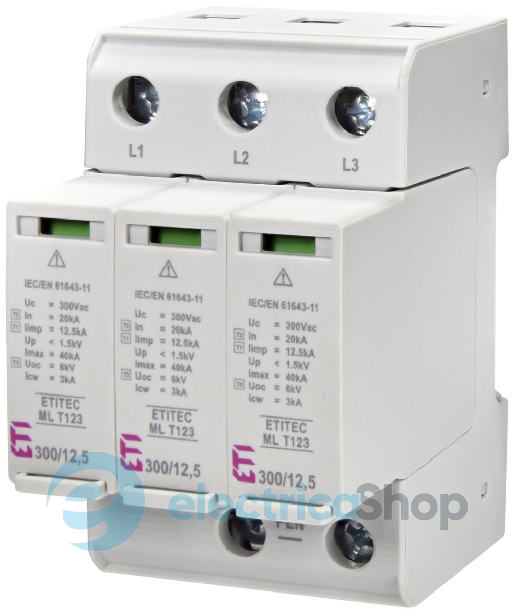 Заміні підлягає лише пошкоджений SPD модуль, при цьому немає необхідності заміни базового блоку.ПЗІП тип моделі: ETITEC ML T123 300/12,5 (3+0, 3p, TNC) групи B+C+D (тип I+II+III)