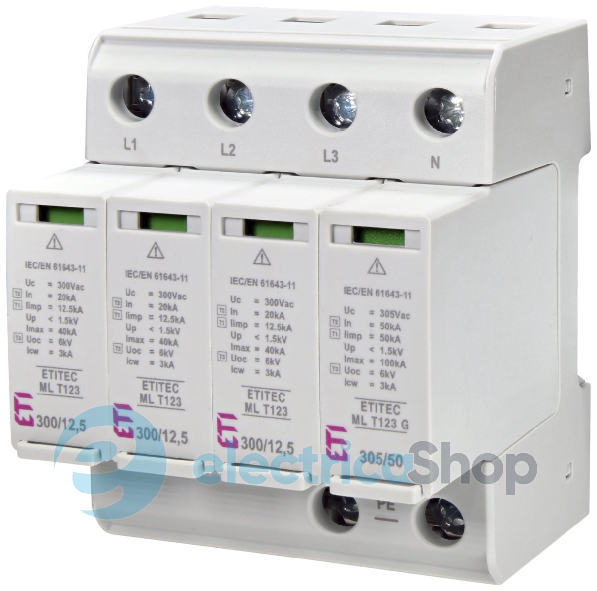 Заміні підлягає лише пошкоджений SPD модуль, при цьому немає необхідності заміни базового блоку.ПЗІП тип моделі: ETITEC ML T123 300/12,5 (3+1, 4p, TT) групи B+C+D (тип I+II+III)