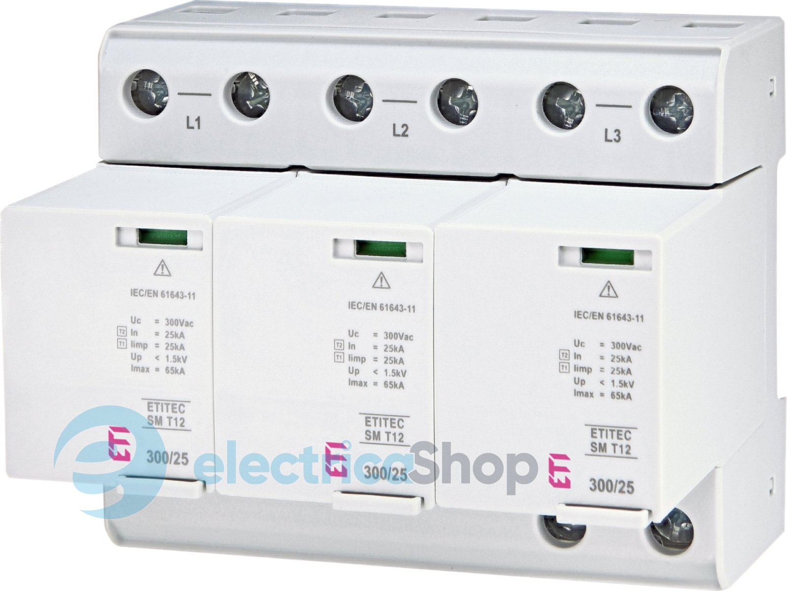 Обмежувач перенапруги без струму витоку ETITEC SM T12 300/25 (3+0, 6p, TNC) (T1,T2/I, II, B+C) (2440560) – призначені для встановлення всередині об’єктів (будівель) для захисту електричних мереж та устаткування.