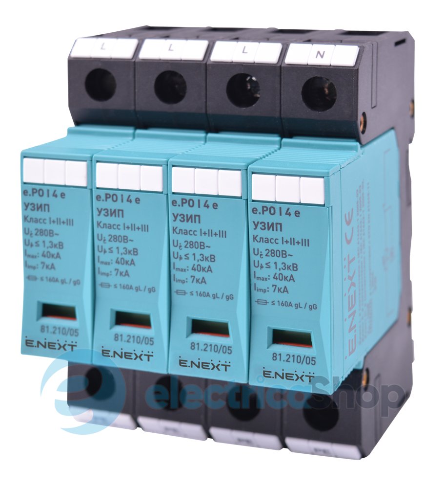 ПЗІП e.PO I 4 e 280V/7kA клас I+II+III, 4 полюси призначено для вирівнювання потенціалів при прямому попаданні блискавки, для відведення енергії імпульсів перенапруги в системах електророзподілу будівель та захисту кінцевих пристроїв. Вони встановлюються на вході зовнішніх провідників у головному розподільчому щиті і містять змінні варистори, що підключаються. Пристрої PO I доступні як з дистанційною сигналізацією, так і без неї.