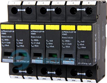 Комбінований ПЗІП e.POmI.3 LCF 90 клас I+II+III, 3 полюси, моноблок призначено для вирівнювання потенціалів при прямому попаданні блискавки, для відведення енергії імпульсів перенапруги в системах електророзподілу будівель та захисту кінцевих пристроїв. Вони встановлюються на вході зовнішніх провідників у головному розподільчому щиті і містять змінні варистори, що підключаються. Пристрої PO I доступні як з дистанційною сигналізацією, так і без неї.