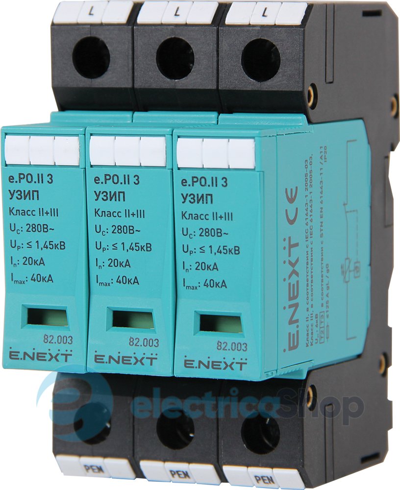 ПЗІП e.POII.3 клас II+III, 3 полюси призначено для відведення енергії імпульсів перенапруги в системах електророзподілу будівель та захисту кінцевих пристроїв. Вони, як правило, встановлюються у вторинних розподільчих щитах. Пристрої PO II доступні з дистанційною сигналізацією, так і без неї.
