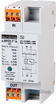 Комбінований ПЗІП e.RPOD F 16 клас III + ВЧ фільтр призначений захисту кінцевих пристроїв від імпульсів перенапруги в системах електророзподілу. Всі ОПН типу 3 (D) мають оригінальну конструкцію з термовимикаючим пристроєм, який водночас є елементом протипожежного захисту. Рекомендується встановлювати ці пристрої якомога ближче до обладнання, що захищається.