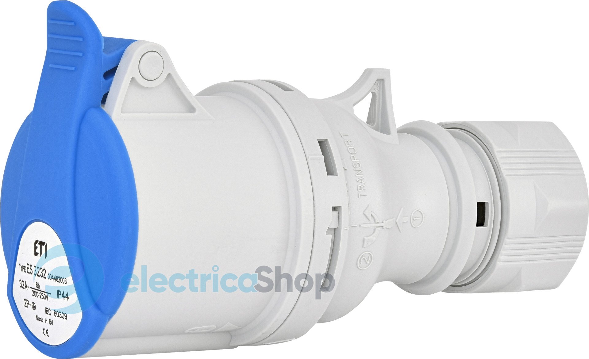 CEE Socket, ES 3232, Ступінь захисту IP IP44, Кількість полюсів 2+PE, Номінальний струм (A) 32, Номінальна напруга (В) 230, Тип розетка вилка Розетка кабельна, Максимальна сила струму 32 A, Сила струму відповідно до UL / CSA (для UL-виконання) A, Кількість полюсів 2 , Напруга відповідно до EN 60309-2 і колір 230 В (50+60 Гц) синя , Положення ключа в годинах / Орієнтація заземл. контакту (по цифербл. годинника) h, Маркувальне забарвлення Синій , Номер кольору Ral , Ступінь захисту IP IP44 , Спосіб підключення Гвинтова клема , Кут підключення Прямолінійний (-а) , Кабельний ввід Ущільнювальна гайка , Матеріал Пластик , Виконання для збройних сил