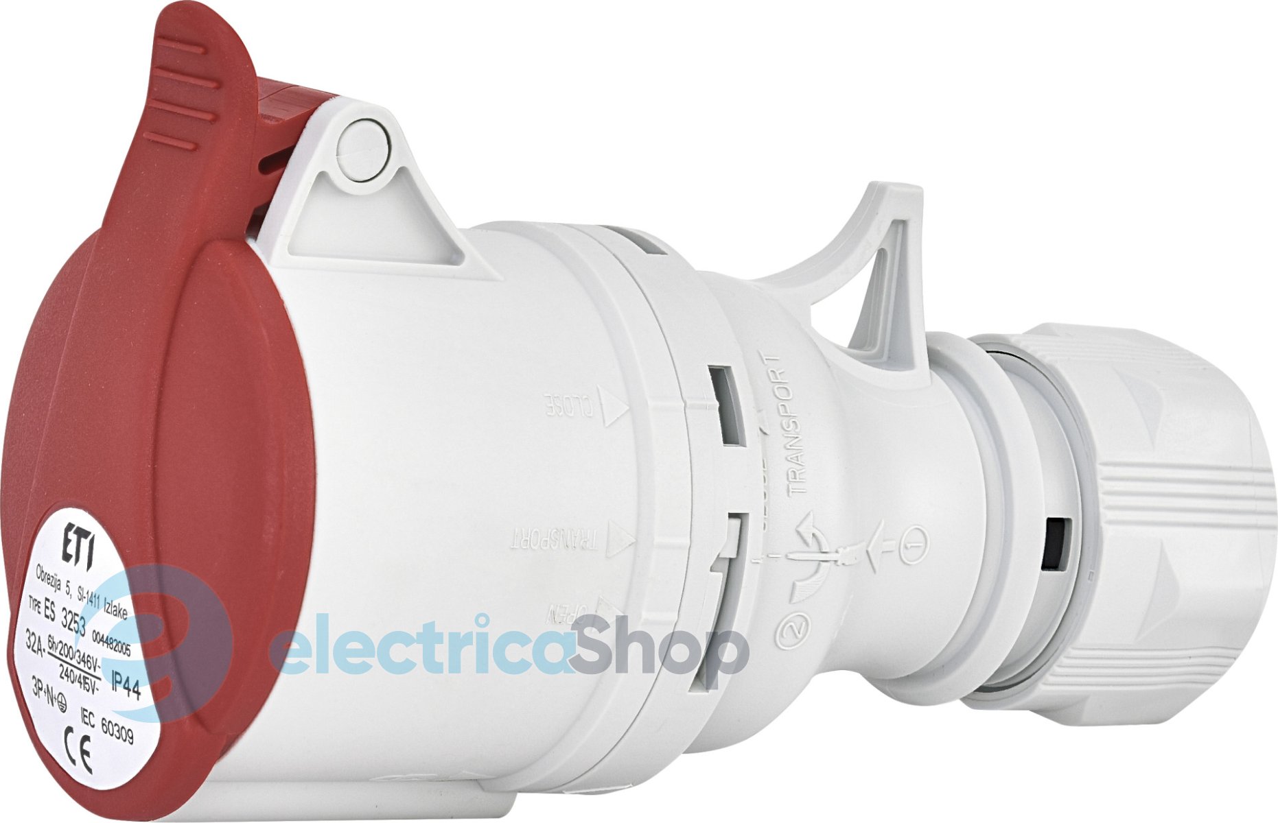 CEE Socket, ES 3253, Ступінь захисту IP IP44, Кількість полюсів 3+N+PE, Номінальний струм (A) 32, Номінальна напруга (В) 400, Тип розетка вилка Розетка кабельна, Максимальна сила струму 32 A, Сила струму відповідно до UL / CSA (для UL-виконання) A, Кількість полюсів 3 , Напруга відповідно до EN 60309-2 і колір 400 В (50+60 Гц) червона , Положення ключа в годинах / Орієнтація заземл. контакту (по цифербл. годинника) h, Маркувальне забарвлення Червоний , Номер кольору Ral , Ступінь захисту IP IP44 , Спосіб підключення Гвинтова клема , Кут підключення Прямолінійний (-а) , Кабельний ввід Ущільнювальна гайка , Матеріал Пластик , Виконання для збройних сил