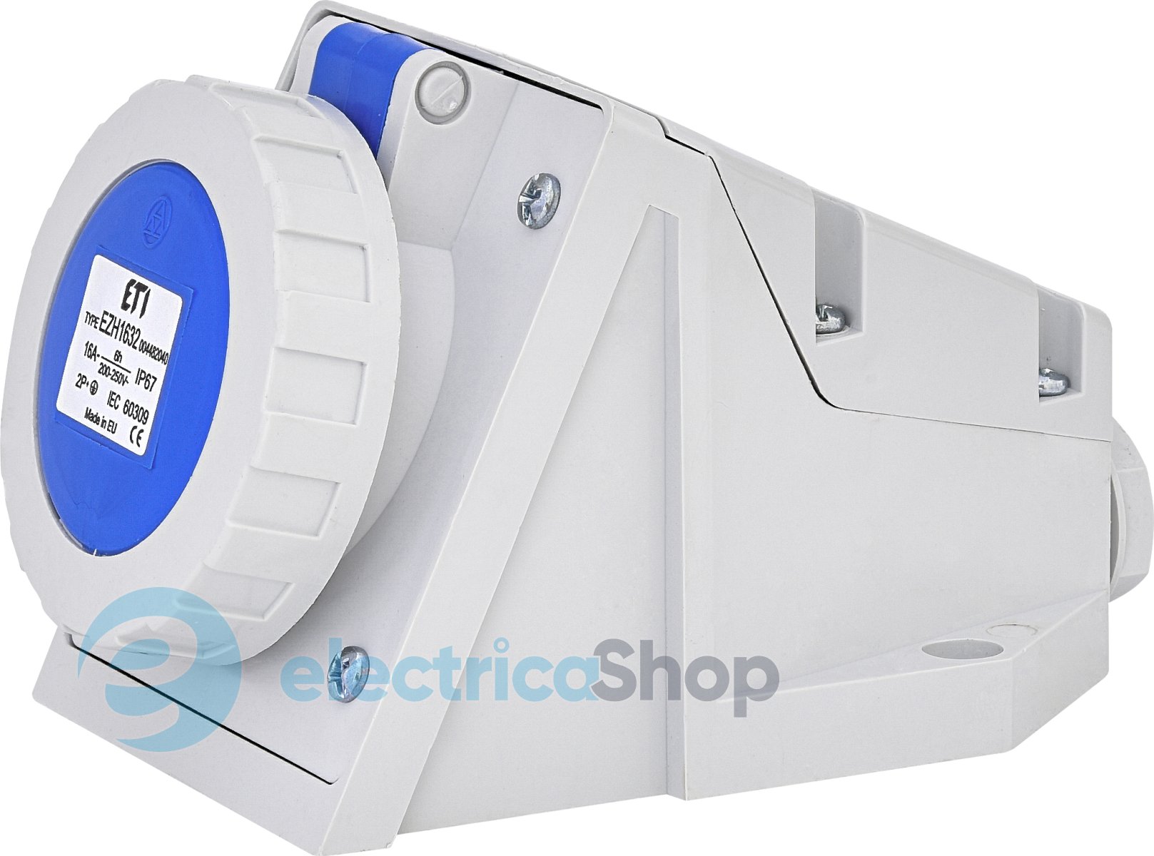 CEE Socket, EZH 1632, Ступінь захисту IP IP67, Кількість полюсів 2+PE, Номінальний струм (A) 16, Номінальна напруга (В) 230, Тип розетка вилка Розетка настінна, Модель/Виконання Відкритої установки , Максимальна сила струму 16 A, Сила струму відповідно до UL / CSA (для UL-виконання) A, Кількість полюсів 2 , Напруга відповідно до EN 60309-2 і колір 230 В (50+60 Гц) синя , Положення ключа в годинах / Орієнтація заземл. контакту (по цифербл. годинника) 6 h, Маркувальне забарвлення Синій , Номер кольору Ral , Ступінь захисту IP IP67 , Спосіб підключення Гвинтова клема , Кабельний ввід , Матеріал Пластик , Тип монтажу/Тип кріплення Внутрішнє закріплення , Ізольований монтаж , Виконання для збройних сил
