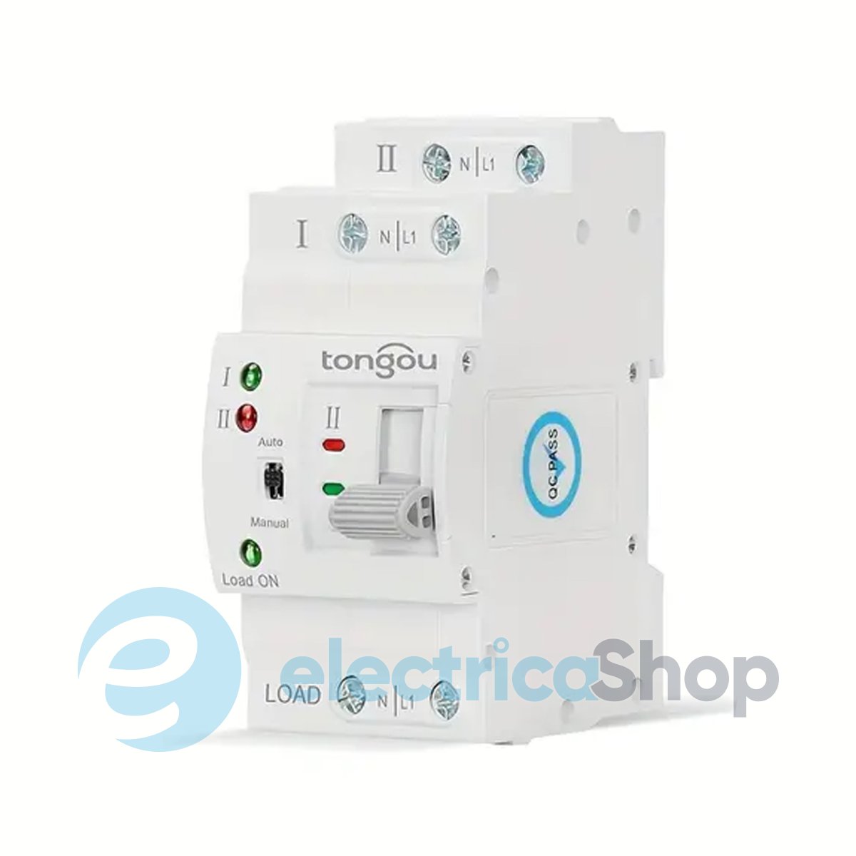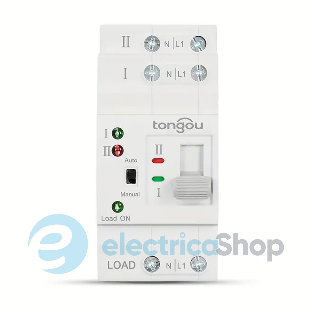 При поновленні основного електроживлення, перемикач автоматично переключить споживача на основне живлення.- Тип: 2-полюсний АВР для 1-фазної мережі.